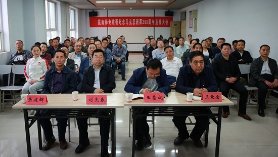 5月4日上午,纪念马克思诞辰200周年大会在人民大会堂隆重举行。中共中央总书记、国家主席、中央军委主席习近平出席大会并发表重要讲话。校长刘先春,党委副书记、纪委书记王莹成,副校长张建辉、王录全等在家校领导和全体中层干部集中收看大会现场直播,认真聆听习近平总书记在纪念大会上的重要讲话。
