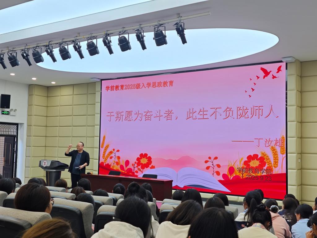9月23日下午,学院在育心楼109特邀马克思主义学院副院长丁汝雄教授以《于斯愿为奋斗者,此生不负陇师人》为题讲授“开学第一课”。丁教授以“奋斗者”为坐标、“陇师精神”为纽带,融合“扎根陇原、甘于奉献”校魂与学前教育“启蒙心智、培育未来”使命,解读时代对幼教工作者的素养要求,传递殷切期许。新生认真聆听记录,立志将理想信念融入专业学习。